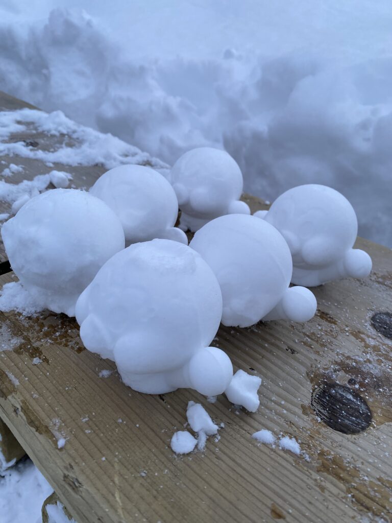 途中、馬の背分岐のベンチに雪で作られたアンパンマンの行列が置かれてまして笑いました。