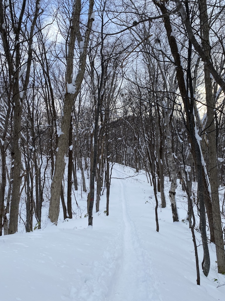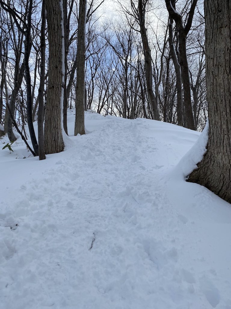 登山道にはしっかりトレースがあるけど固まってないので思いのほか歩きづらかったです。斜度が上がるとずり落ちる感じだったので爪先を刺すようにして登って行きました。標高差160メートルくらい登ったら陽当たりのお陰なのか、しっかり踏み固まっていてそれ以降は楽になりました。