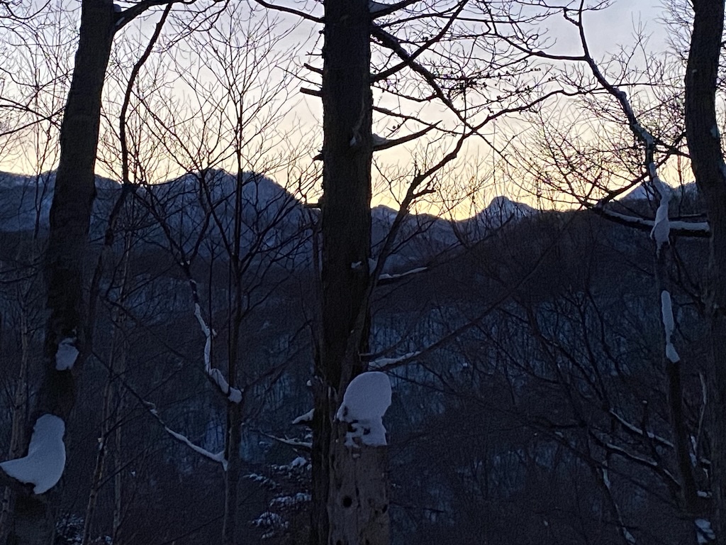 太陽が向こうの山の影になった頃に木々の向こうに見えた砥石山〜神居岳〜烏帽子岳のシルエットの美しさは素晴らしかったな。新月から2日目の三日月もいい感じ。