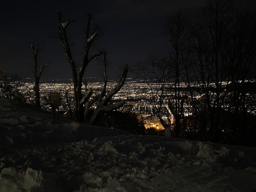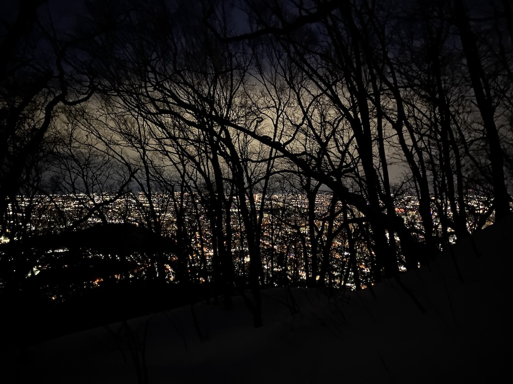 落葉の終わった冬の夜の最大の楽しみ。ヘッデン消して写真撮ったけど伝わらないな。ほんと凄い夜景。