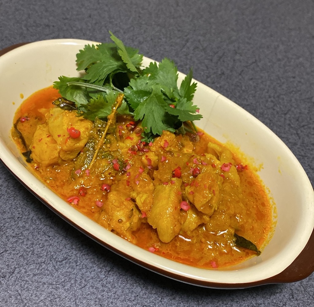 弱火で加熱している間に玉ねぎ半玉とニンニク2カケをワイヤーハンドル付野菜チョッパーに入れて30引きくらいのみじん切り、生姜とおろし器の用意、小皿にパウダースパイス(コリアンダー・クミン・カイエン・フェネグリーク・カルダモン、あと何か適当に入れた気がします)も用意。